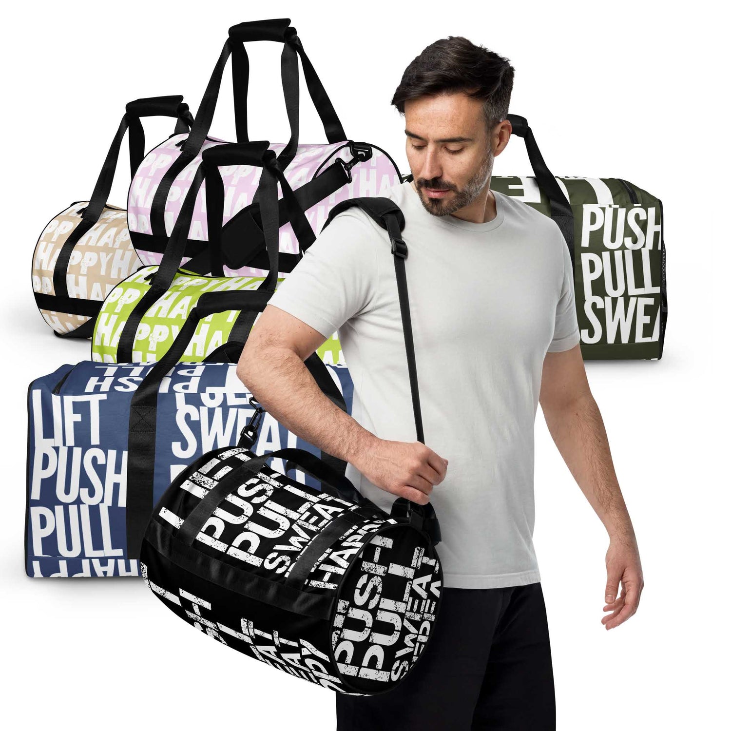Duffle Bag “Lift Push Pull Sweat Repeat Happy” Stacked Print Black Gym Bag