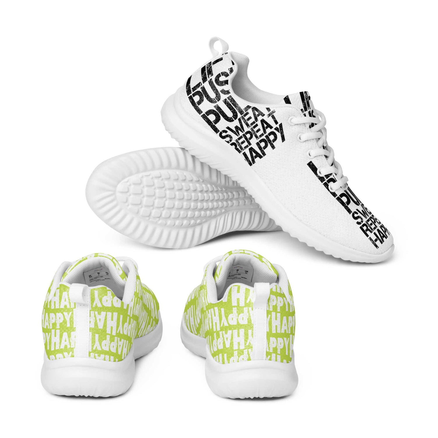 Gym Shoes "Lift Push Pull Sweat Repeat Happy" Distress Print Men's Black On White Athletic Shoes