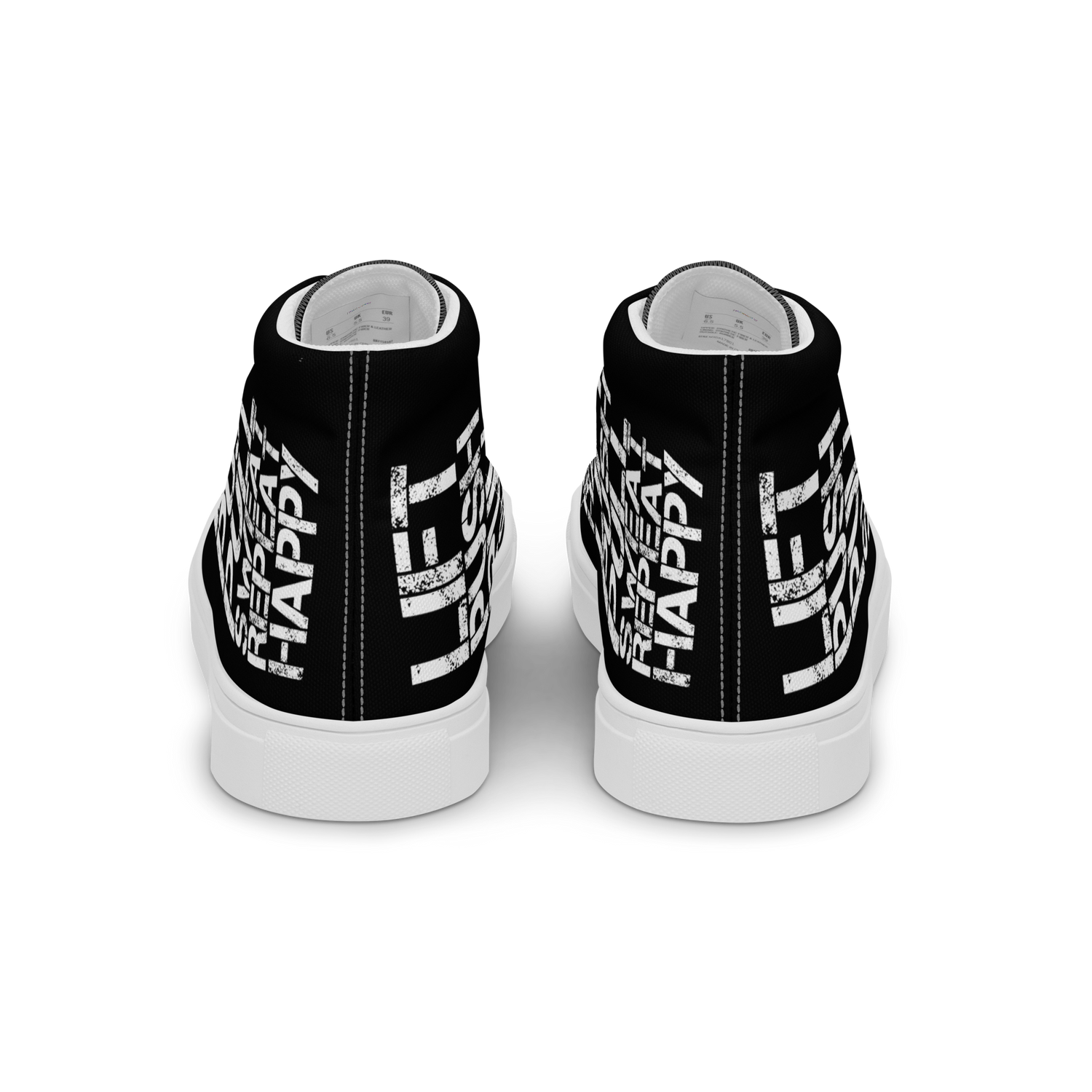 Gym Shoe "Lift Push Pull Sweat Repeat Happy" Distress Print Men's Black High Tops Black Sole