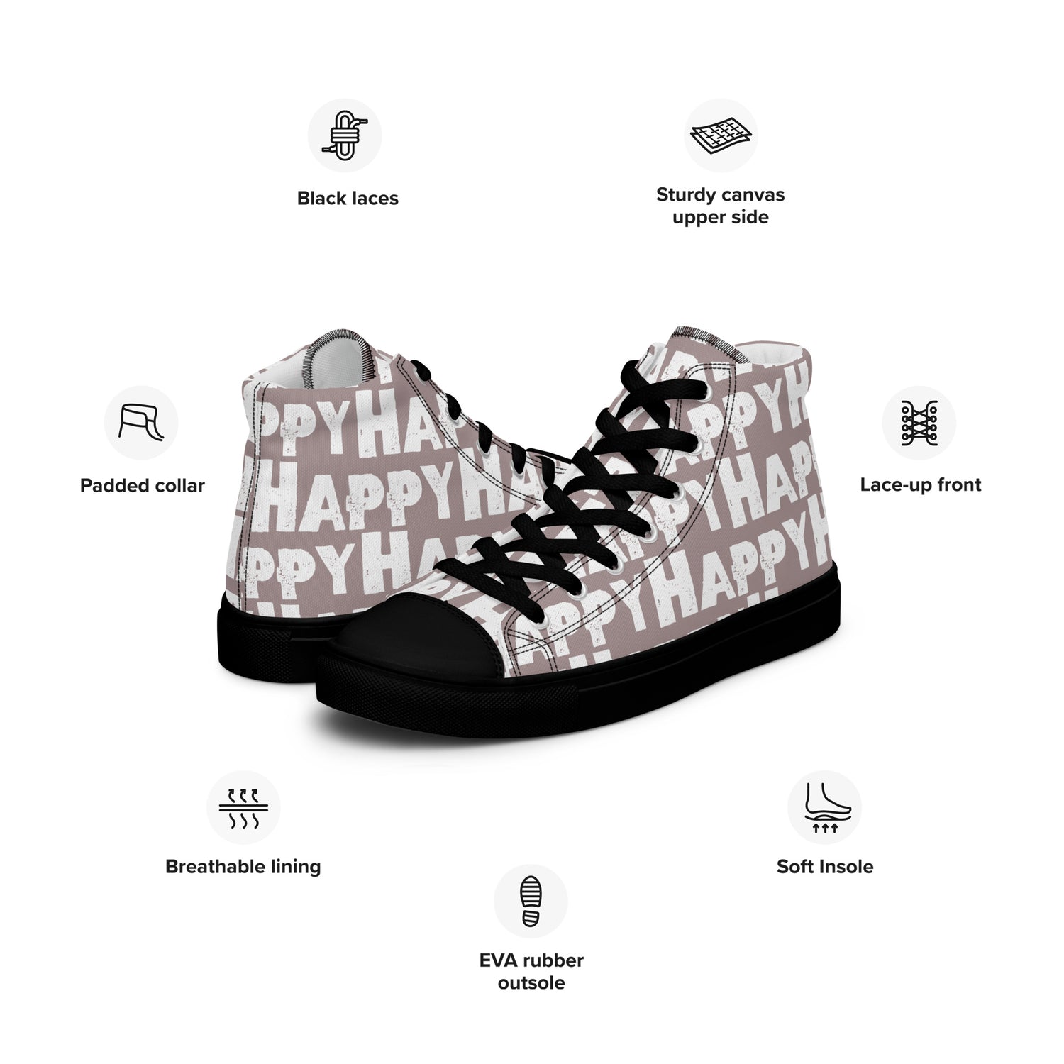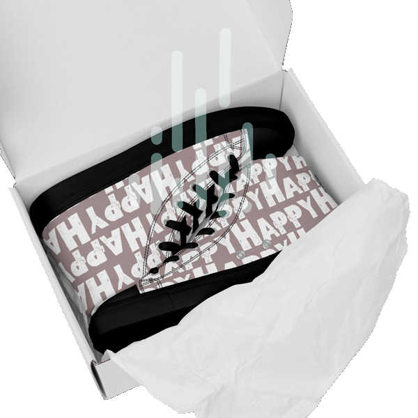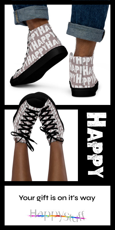 This is one fun shoe, well, actually two. With the word happy printed boldly in white all over great streetwear colours these taupe men's sneakers are the happiest shoes you'll ever own! Canvas high tops made with breathable fabrics and comfy padded collar feel as good as they look. You'll love how many smiles your happy shoes get you.