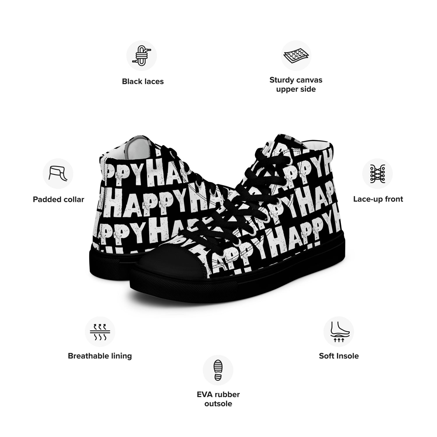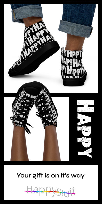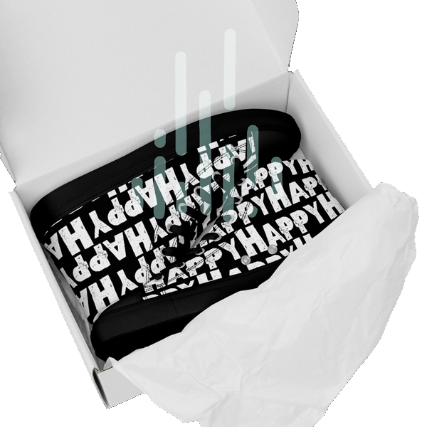 Women's black sneakers for happy shoe lovers ~ The happiest shoe you'll ever own! With the word happy artfully printed boldly in white all over bright coloured canvas high top sneakers made with breathable fabrics and comfy padded collar help you stay cool while looking cool. You'll love how many smiles your happy shoes elicit. This is one fun shoe, well, actually two : )