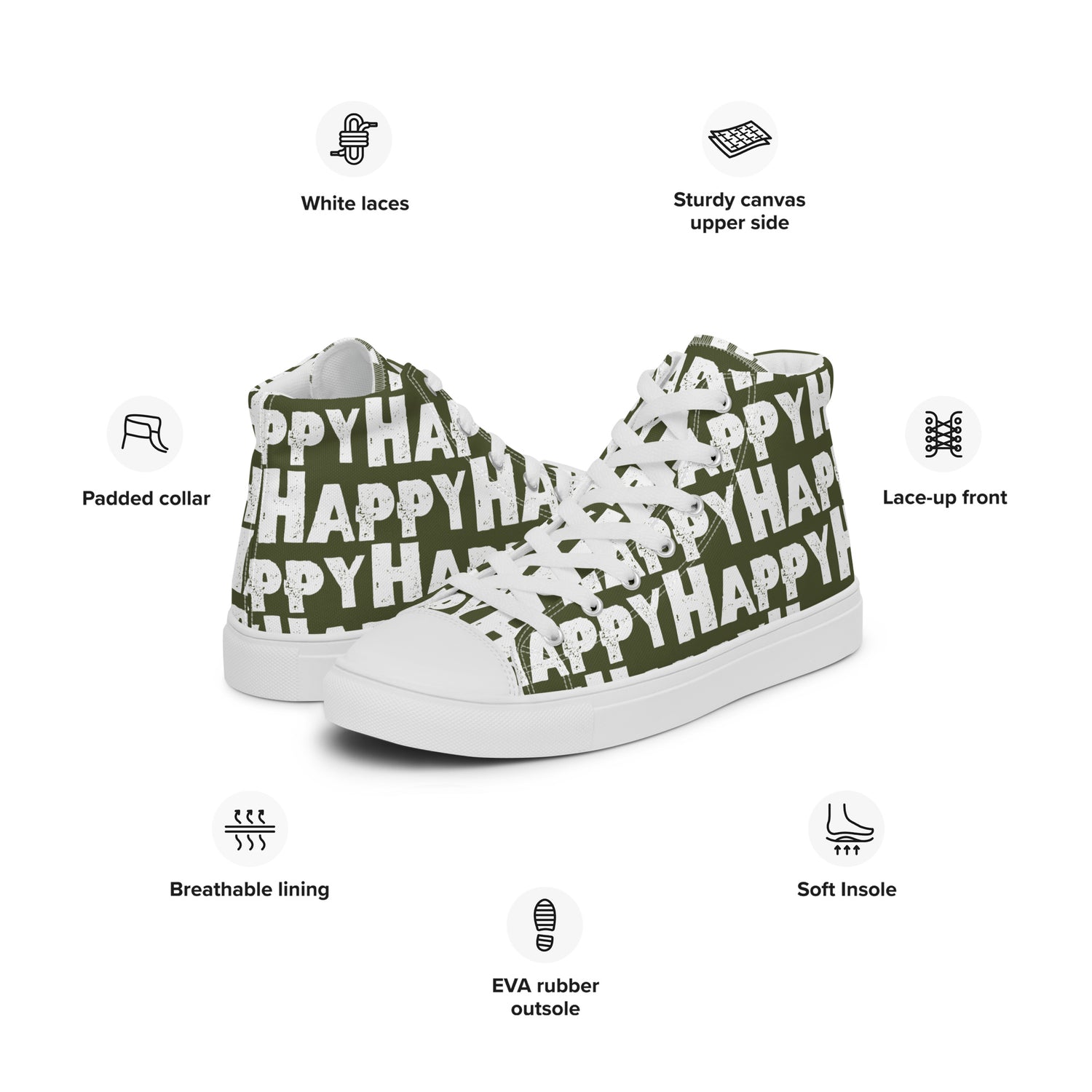 This is one fun shoe, well, actually two. With the word happy printed boldly in white all over great streetwear colours these khaki green women's sneakers are the happiest shoes you'll ever own! Canvas high tops made with breathable fabrics and comfy padded collar feel as good as they look. You'll love how many smiles your happy shoes get you.