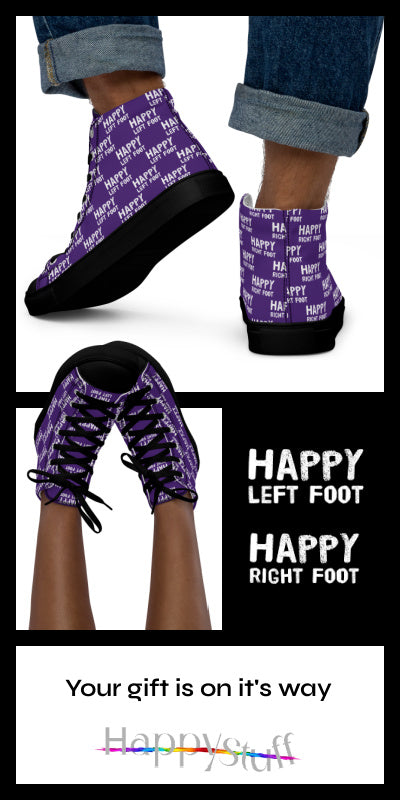 Get your happy on in these not-so-classic checkered look, fun shoes. Purple high tops, each shoe individually exclaiming "Happy Left Foot" "Happy Right Foot" Pattern Print Women's Sneakers. Step into style and comfort with breathable fabrics, comfy padded collar and soft insole. You'll have the happiest feet around!