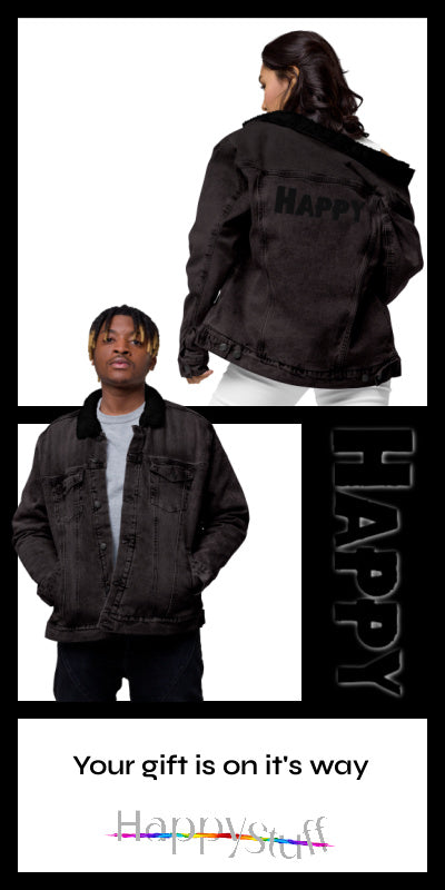 Black denim jacket happy on the outside, sherpa lined warm on the inside, plus sleeves! 99% cotton, all gender, classic relaxed fit denim jacket with "fur" including the usual side and button flap chest pockets. Featuring a giant "Happy" embroidered on the back, show em your fun side in your quirk-tastic jean jacket!
