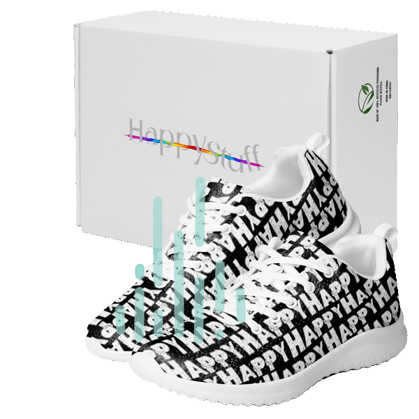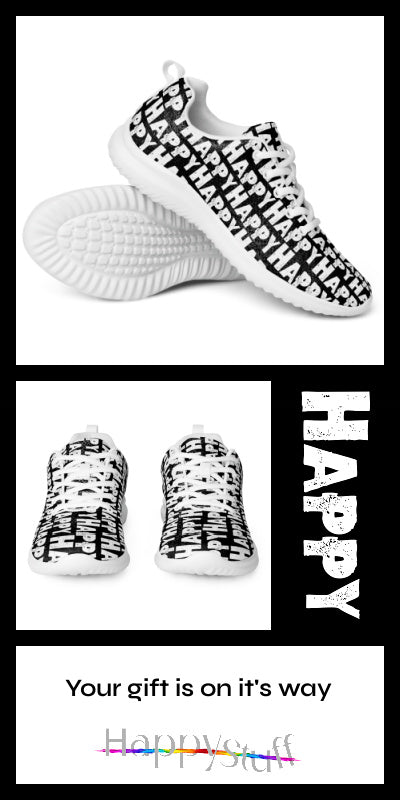 Attract a smile with style, HappyStuff soft knit distressed look black sneakers, lightweight, comfortable, serrated sole, sleek design happy shoes with the word "Happy" sponge printed in white all overtop great colours. You'll want more than one. A women's athletic shoe that takes athleisure fun to a whole new level : )