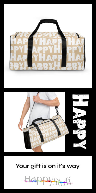 Happy weekend bag - tote around your worldly wares in this cheerful, spacious "Happy" Sponge Print Duffle Bag! Perfect cottage bag! Adjustable shoulder strap, dual padded handles, outside and inside pockets and reinforced bottom, you'll be ready for anything - day trips, the gym, or international adventures. Fantastic colours to share your style. Black, Beige, Green, Grey and Pink duffle bags.
