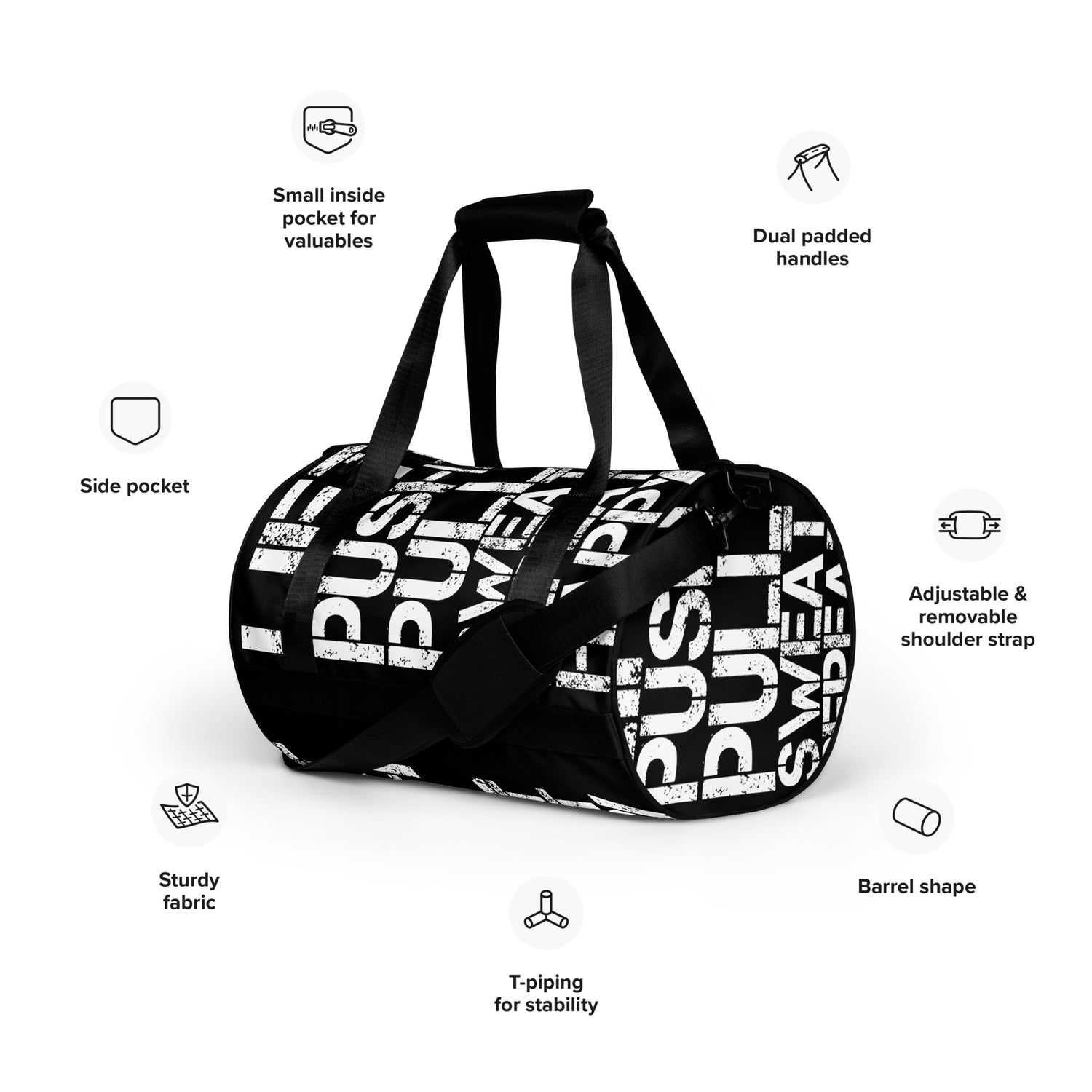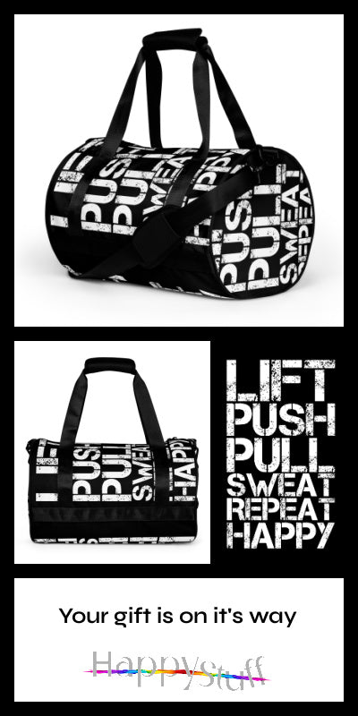 Flaunt your fitness enthusiasm with your Lift Push Pull Sweat Repeat Happy Distress Print Black Small Duffle Bag. A small gym bag that makes a big statement and holds all you need to get to the gym. Don’t just carry your gear, show up with attitude. Available in more gym bag colours than you can shake a dumbbell at.