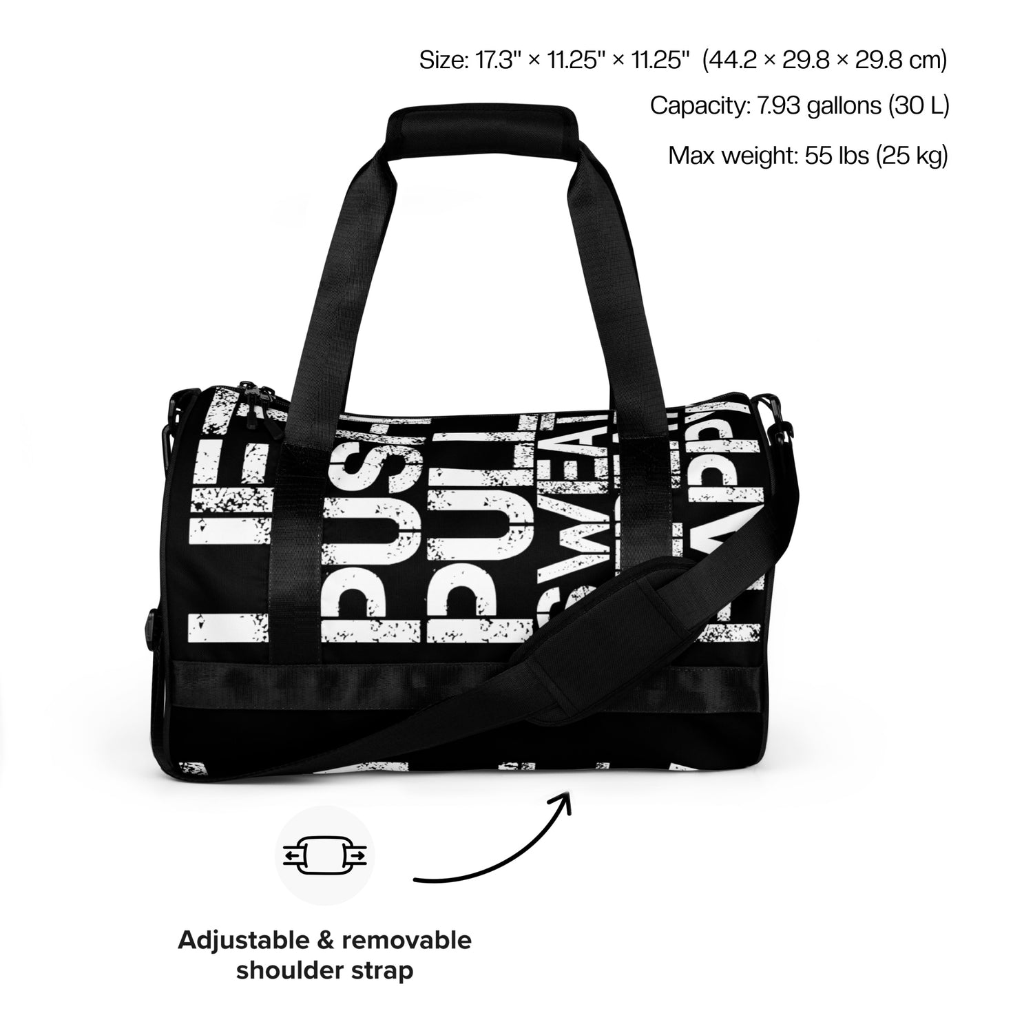 Gym Bag "Lift Push Pull Sweat Repeat Happy" Distress Print Black Small Duffle Bag