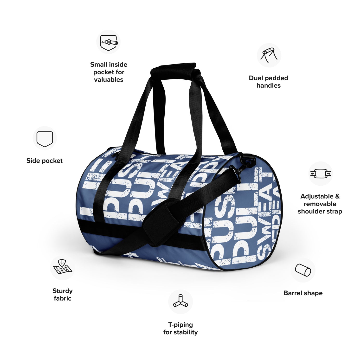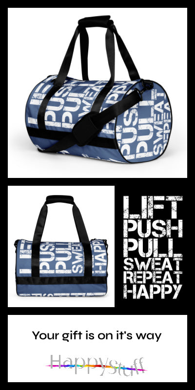 Flaunt your fitness enthusiasm with your Lift Push Pull Sweat Repeat Happy Distress Print Denim Blue Small Duffle Bag. A small gym bag that makes a big statement and holds all you need to get to the gym. Don’t just carry your gear, show up with attitude. Available in more gym bag colours than you can shake a dumbbell at.