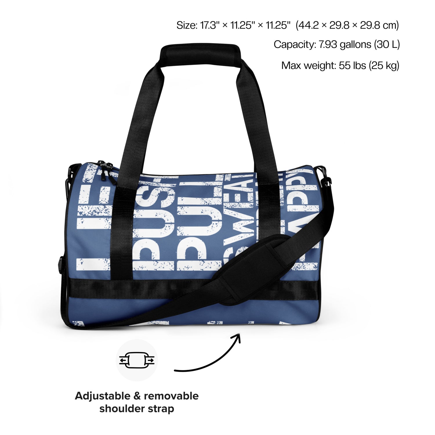 Gym Bag "Lift Push Pull Sweat Repeat Happy" Distress Print Navy Blue Small Duffle Bag