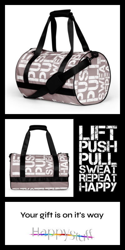 Flaunt your fitness enthusiasm with your Lift Push Pull Sweat Repeat Happy Distress Print Taupe Small Duffle Bag. A small gym bag that makes a big statement and holds all you need to get to the gym. Don’t just carry your gear, show up with attitude. Available in more gym bag colours than you can shake a dumbbell at.