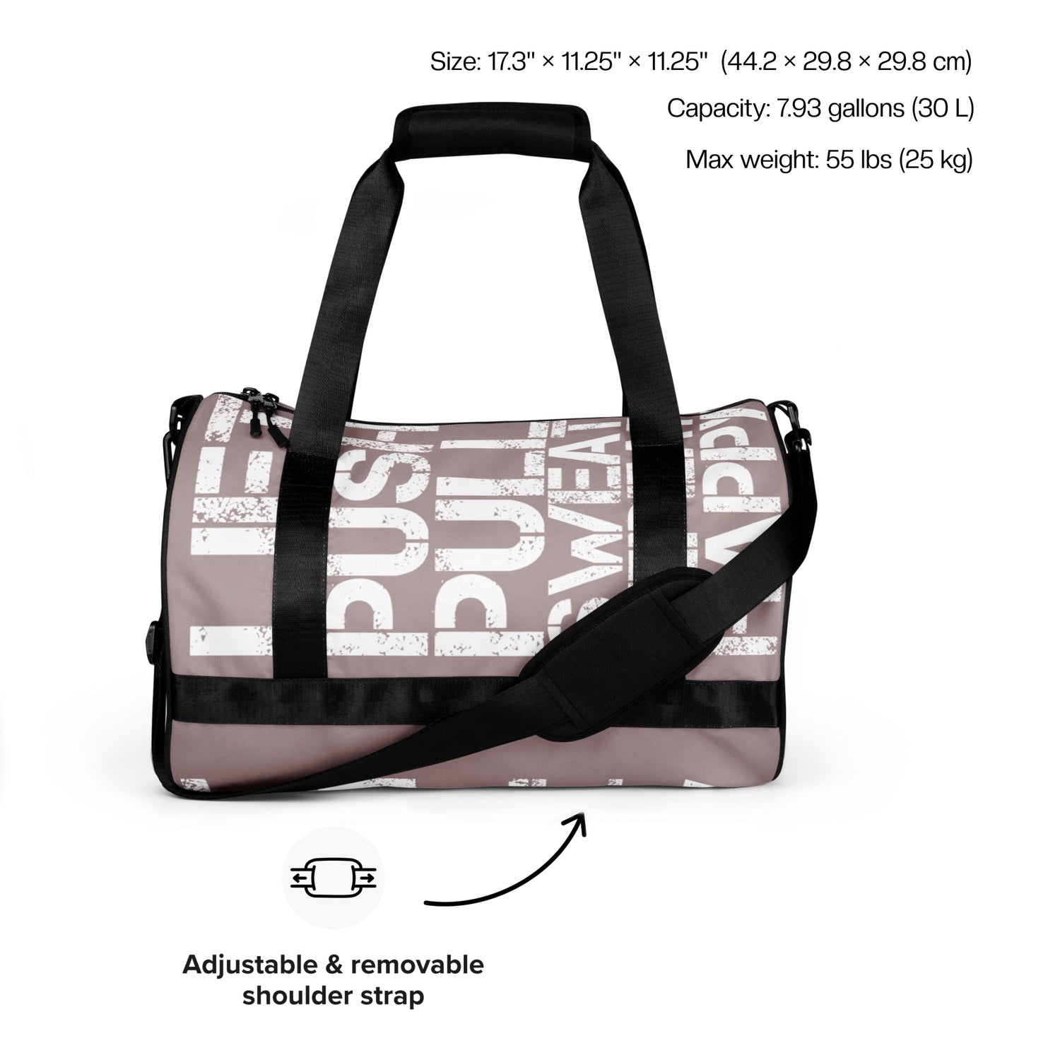 Gym Bag "Lift Push Pull Sweat Repeat Happy" Distress Print Taupe Small Duffle Bag