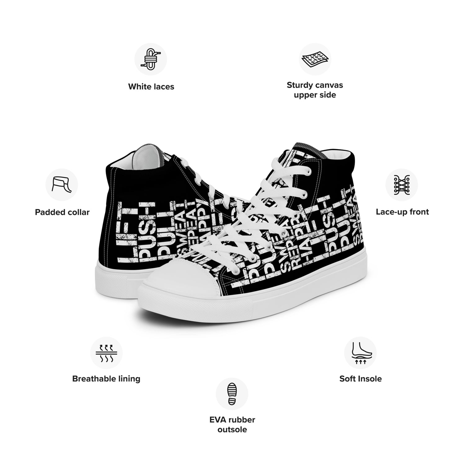 Gym Shoe "Lift Push Pull Sweat Repeat Happy" Distress Print Men's Black High Tops Black Sole