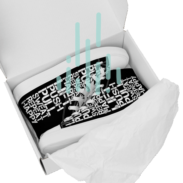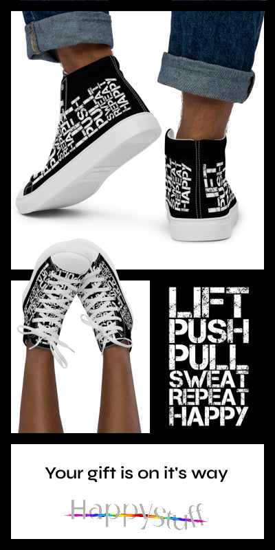 Not exactly a Gym Shoe "Lift Push Pull Sweat Repeat Happy" Distress Print Men's Black High Tops scream fun shoes for the gym lover. The cushy insole, breathable lining and a soft padded collar might just workout in the gym (get it?) and, so many great streetwear colours to choose from to take you anywhere you wanna go.