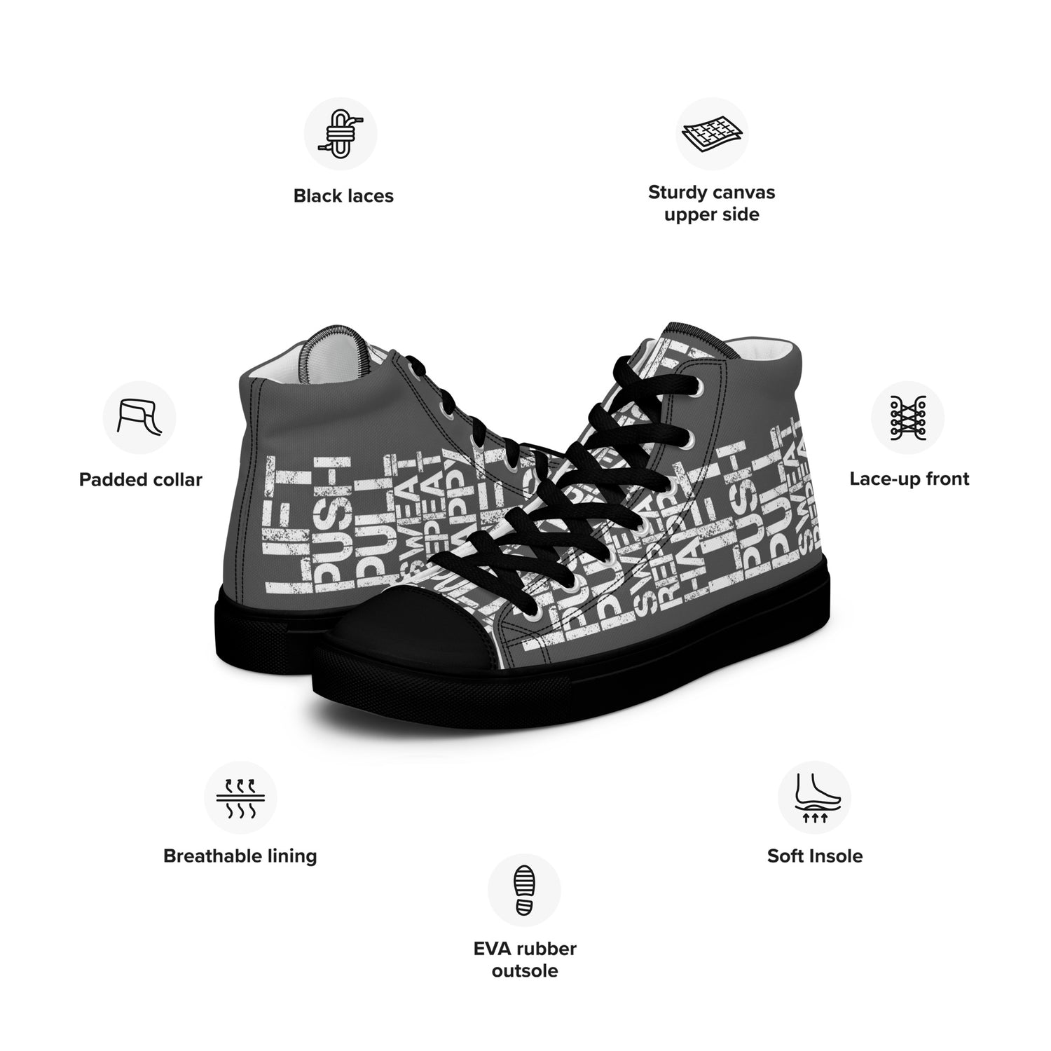 Gym Shoe "Lift Push Pull Sweat Repeat Happy" Distress Print Men's Slate Grey High Tops