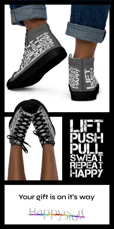 Not exactly a Gym Shoe "Lift Push Pull Sweat Repeat Happy" Distress Print Men's Slate Grey High Tops scream fun shoes for the gym lover. The cushy insole, breathable lining and a soft padded collar might just workout in the gym (get it?) and, so many great streetwear colours to choose from to take you anywhere you wanna go.