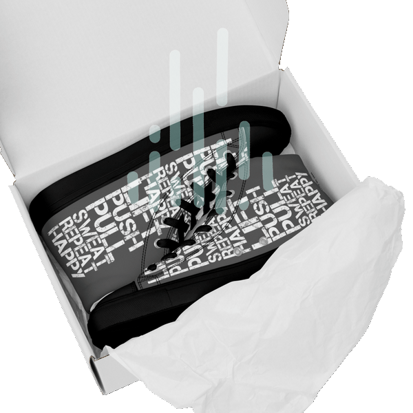 Gym Shoe "Lift Push Pull Sweat Repeat Happy" Distress Print Men's Slate Grey High Tops Black Sole