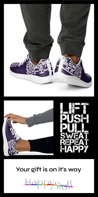Gym rat dark purple gym shoes proudly proclaiming "Lift Push Pull Sweat Repeat Happy" aptly distress printed on a lightweight comfortable great looking men's athletic shoe with serrated sole, cushy insole, breathable lining and soft padded collar. Also available in all the right colours to match your workout groove. Tie em up and Lift Push Pull Sweat Repeat Happy!!!
