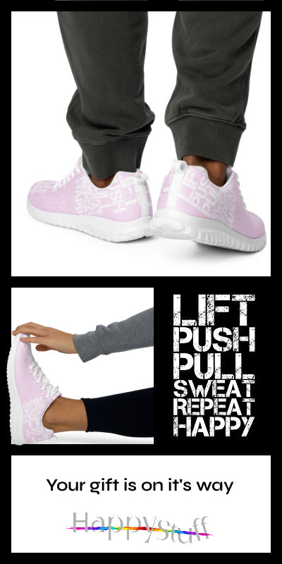 Gym rat pink gym shoes proudly proclaiming "Lift Push Pull Sweat Repeat Happy" aptly distress printed on a lightweight comfortable great looking women's athletic shoe with serrated sole, cushy insole, breathable lining and soft padded collar. Also available in all the right colours to match your workout groove. Tie em up and Lift Push Pull Sweat Repeat Happy!!!