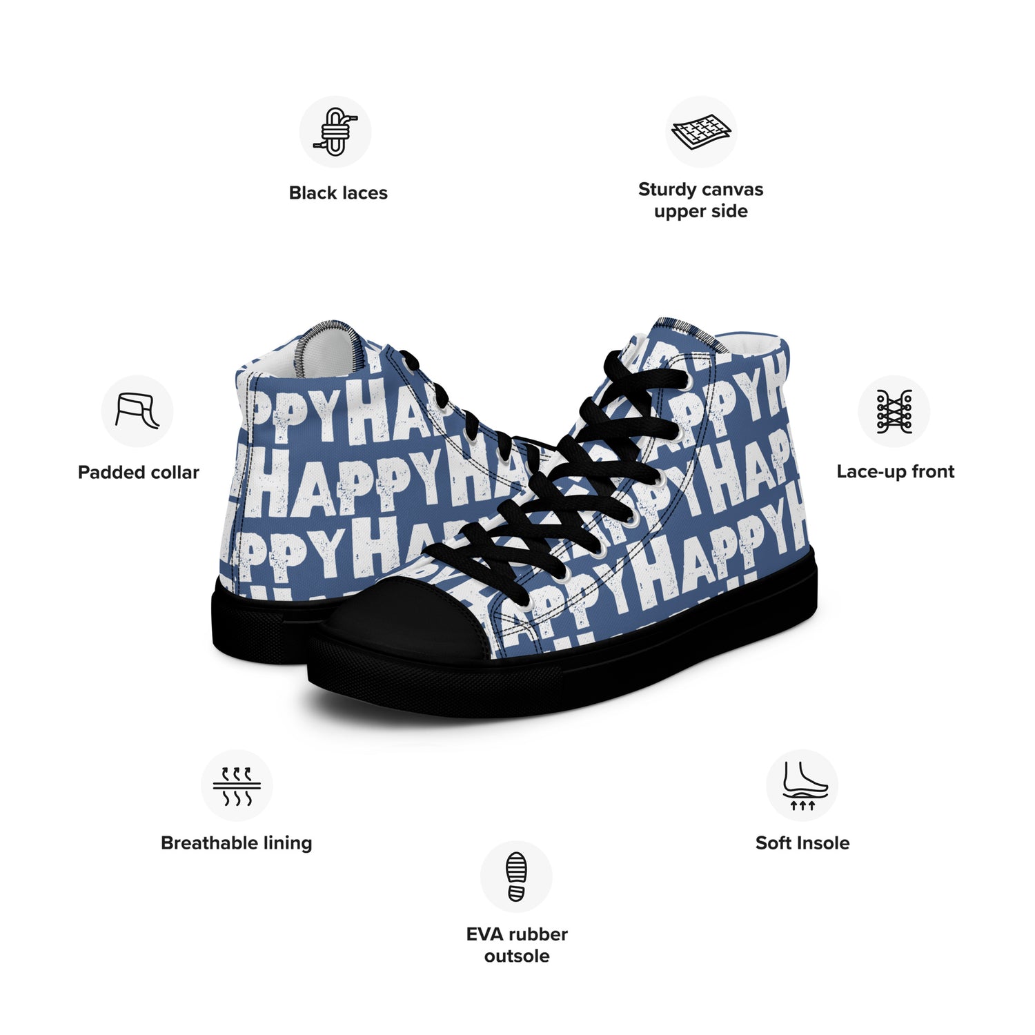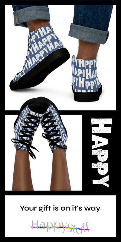 This is one fun shoe, well, actually two. With the word happy printed boldly in white all over great streetwear colours these denim blue men's sneakers are the happiest shoes you'll ever own! Canvas high tops made with breathable fabrics and comfy padded collar feel as good as they look. You'll love how many smiles your happy shoes get you.