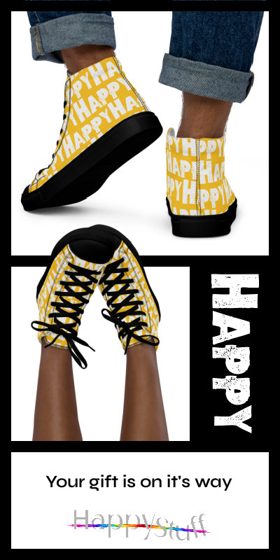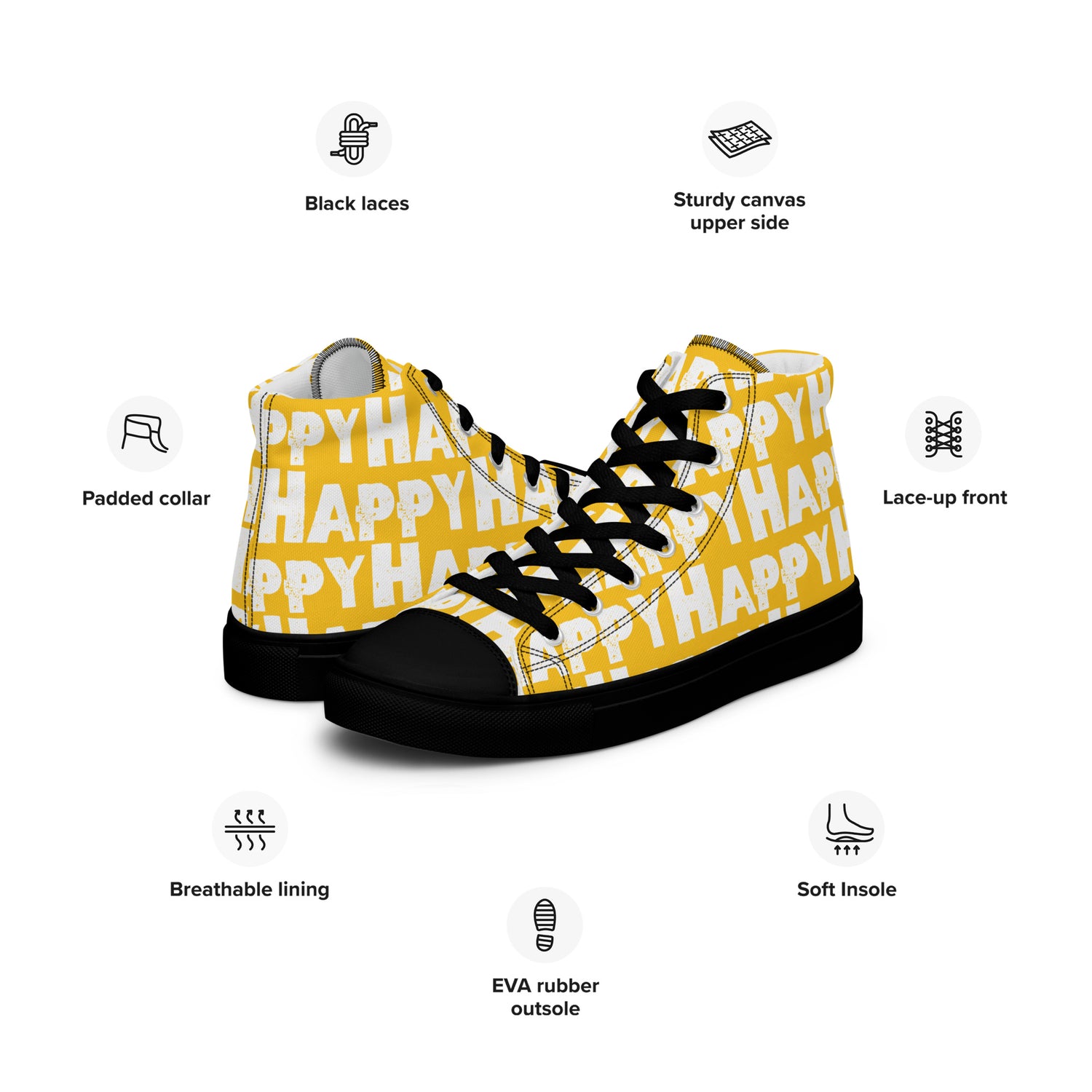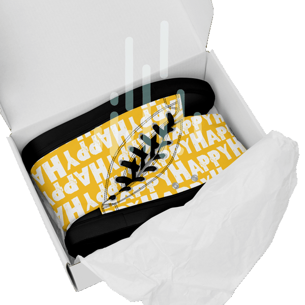 Women's yellow sneakers for happy shoe lovers ~ The happiest shoe you'll ever own! With the word happy artfully printed boldly in white all over bright coloured canvas high top sneakers made with breathable fabrics and comfy padded collar help you stay cool while looking cool. You'll love how many smiles your happy shoes elicit. This is one fun shoe, well, actually two : )