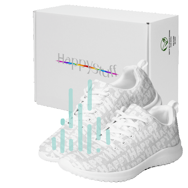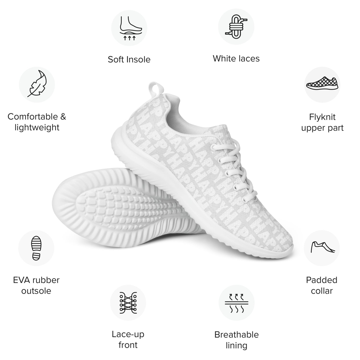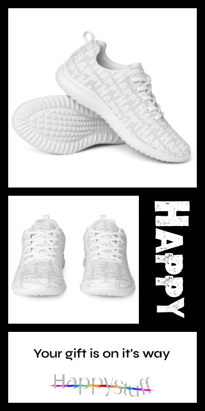 Attract a smile with style, HappyStuff soft knit distressed look light grey sneakers, lightweight, comfortable, serrated sole, sleek design happy shoes with the word "Happy" sponge printed in white all overtop great colours. You'll want more than one. A men's athletic shoe that takes athleisure fun to a whole new level : )