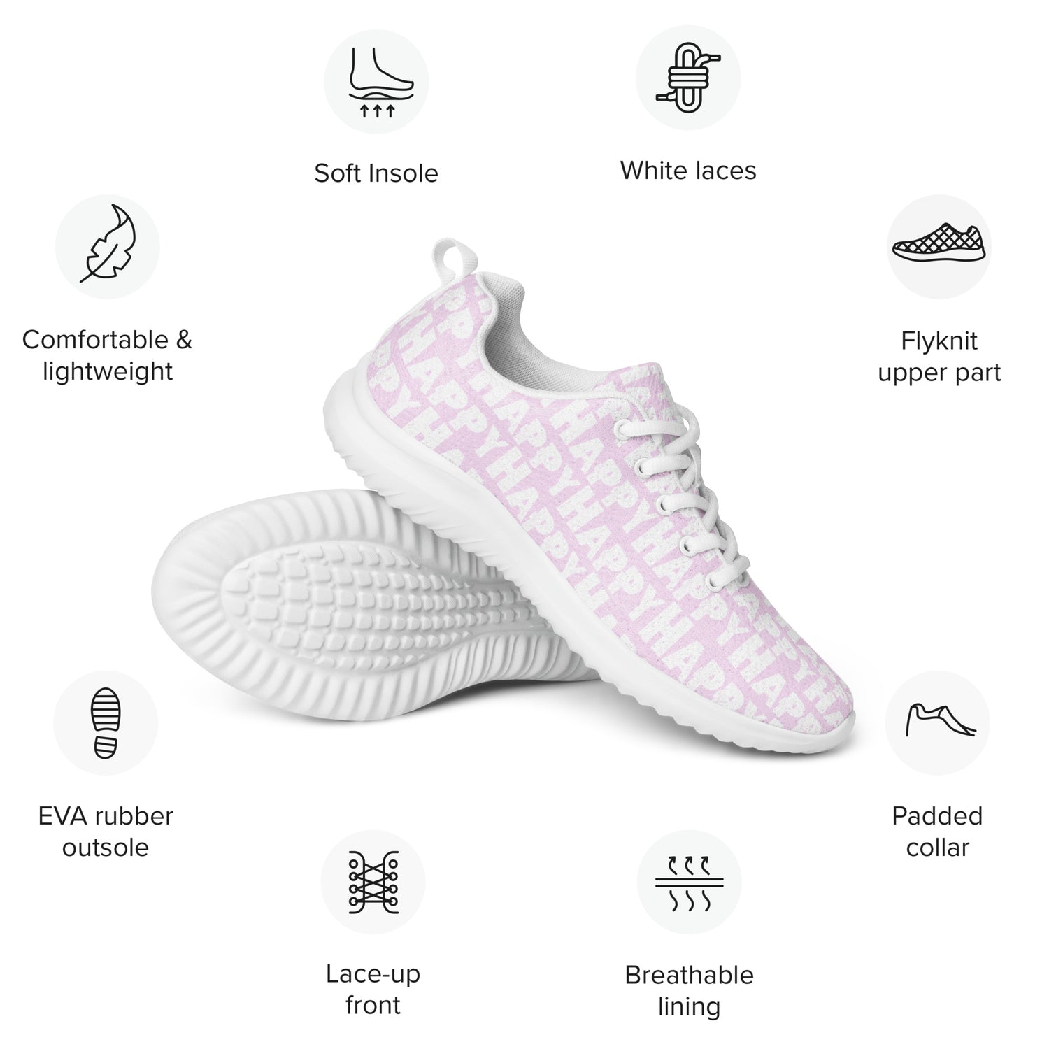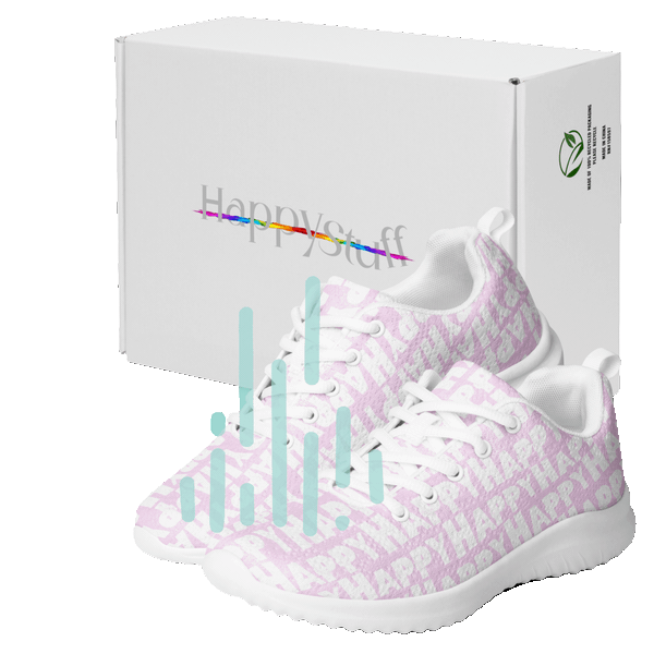 Attract a smile with style, HappyStuff soft knit distressed look pink sneakers, lightweight, comfortable, serrated sole, sleek design happy shoes with the word "Happy" sponge printed in white all overtop great colours. You'll want more than one. A women's athletic shoe that takes athleisure fun to a whole new level : )
