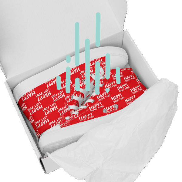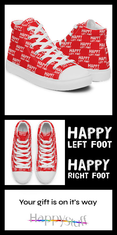 Get your happy on in these not-so-classic checkered look, fun shoes. Red high tops, each shoe individually exclaiming "Happy Left Foot" "Happy Right Foot" Pattern Print Men's Sneakers. Step into style and comfort with breathable fabrics, comfy padded collar and soft insole. You'll have the happiest feet around!