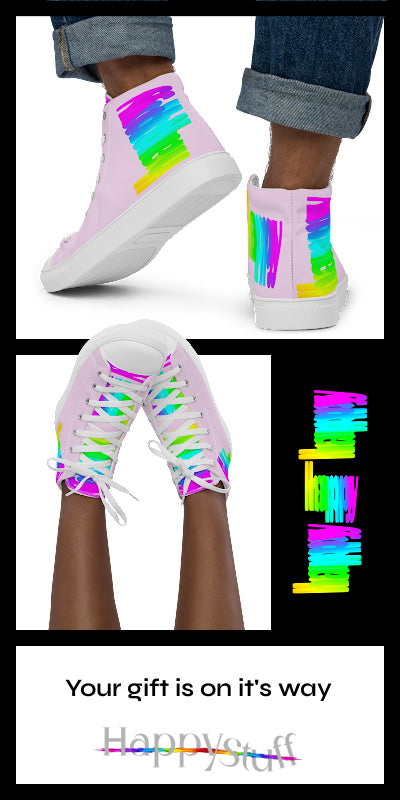 Walk on the colourful side of life in these Women's High Top Sneakers Happy Rainbow Painted Canvas Pink Shoes. Featuring comfy padding, breathable fabrics, soft insole and the word Happy boldly printed in a bright color spectrum front and centre on the tongue and heal sides. The pride of any rainbow shoes shoe lovers!