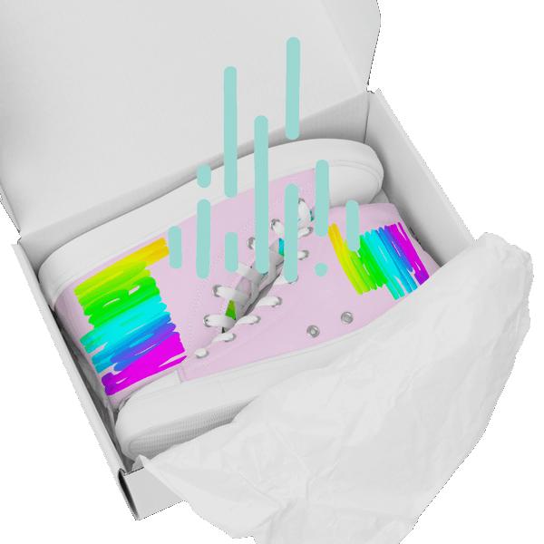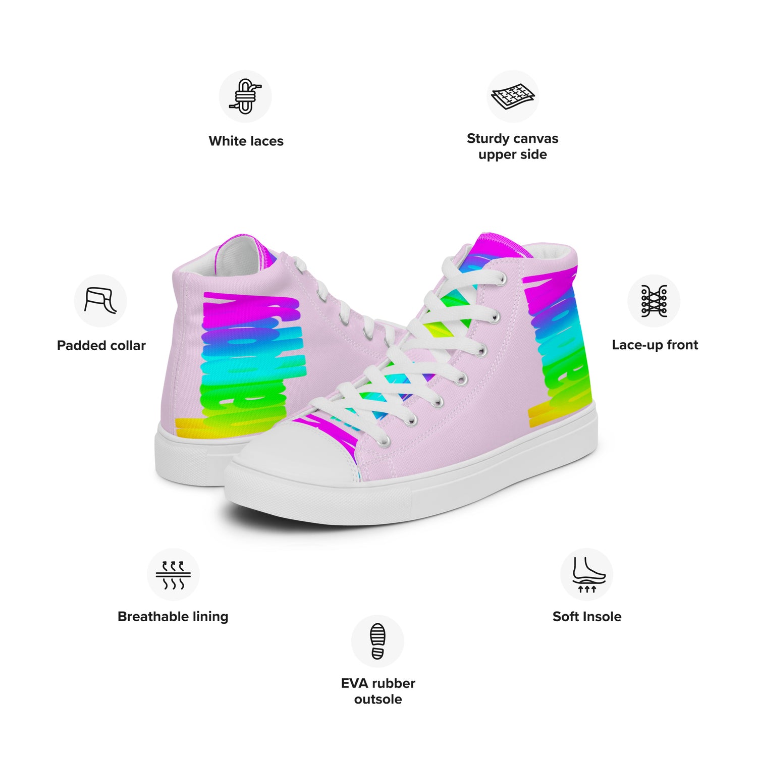 Women's High Top Sneakers "Happy" Rainbow Painted Canvas Pink Shoes Black Sole