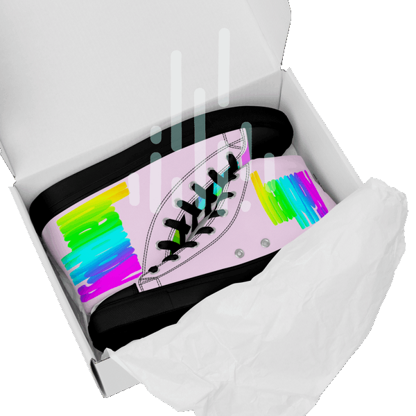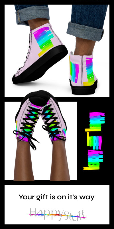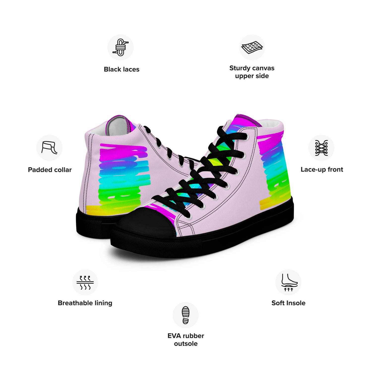 Women's High Top Sneakers "Happy" Rainbow Painted Canvas Pink Shoes Black Sole