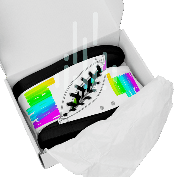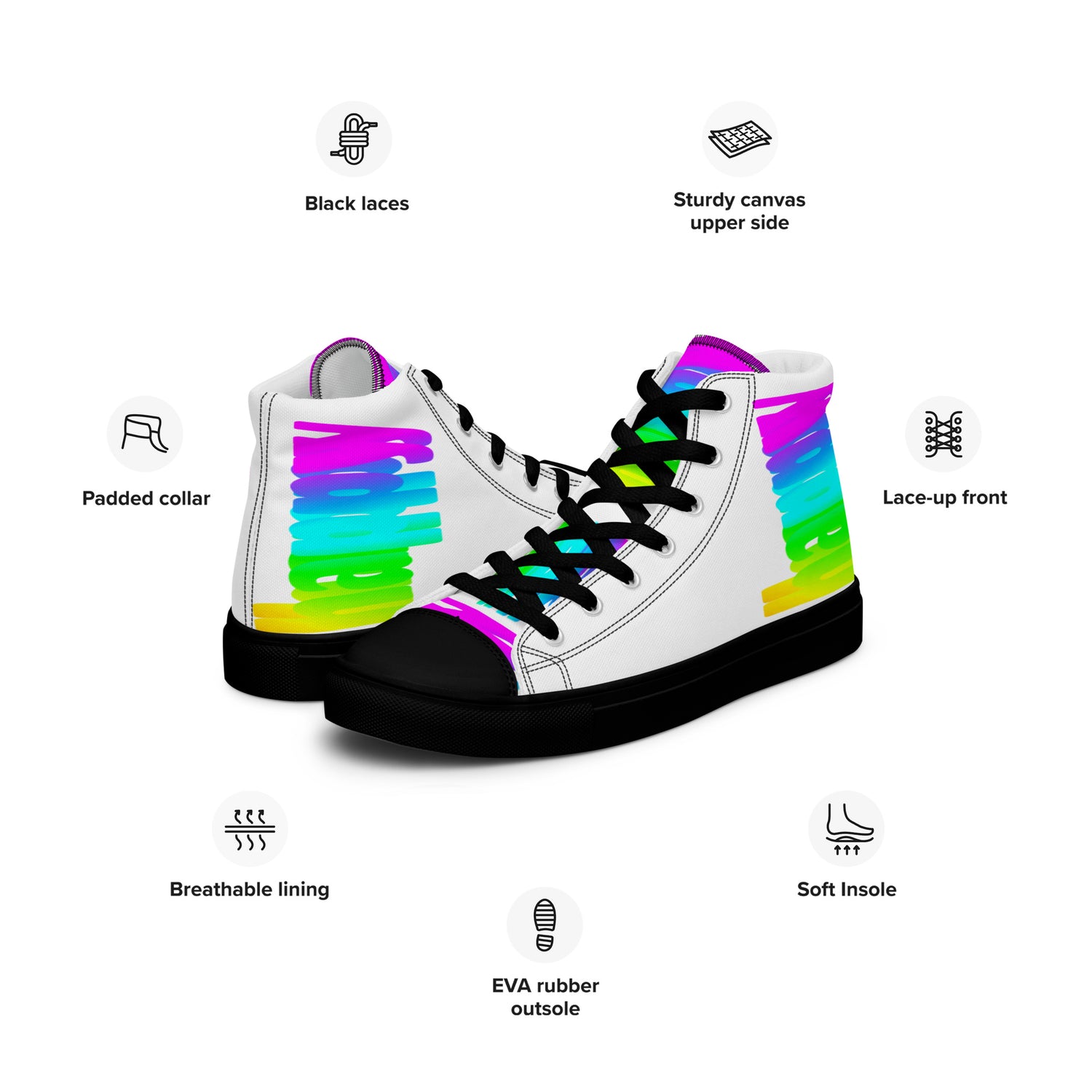 Women's High Top Sneakers "Happy" Rainbow Painted Canvas White Shoes Black Sole