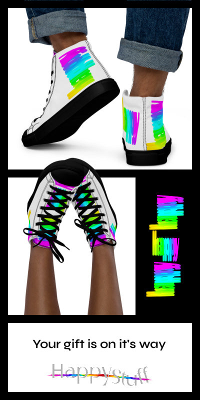 Walk on the colourful side of life in these Women's High Top Sneakers Happy Rainbow Painted Canvas White Shoes. Featuring comfy padding, breathable fabrics, soft insole and the word Happy boldly printed in a bright color spectrum front and centre on the tongue and heal sides. The pride of any rainbow shoes shoe lovers!